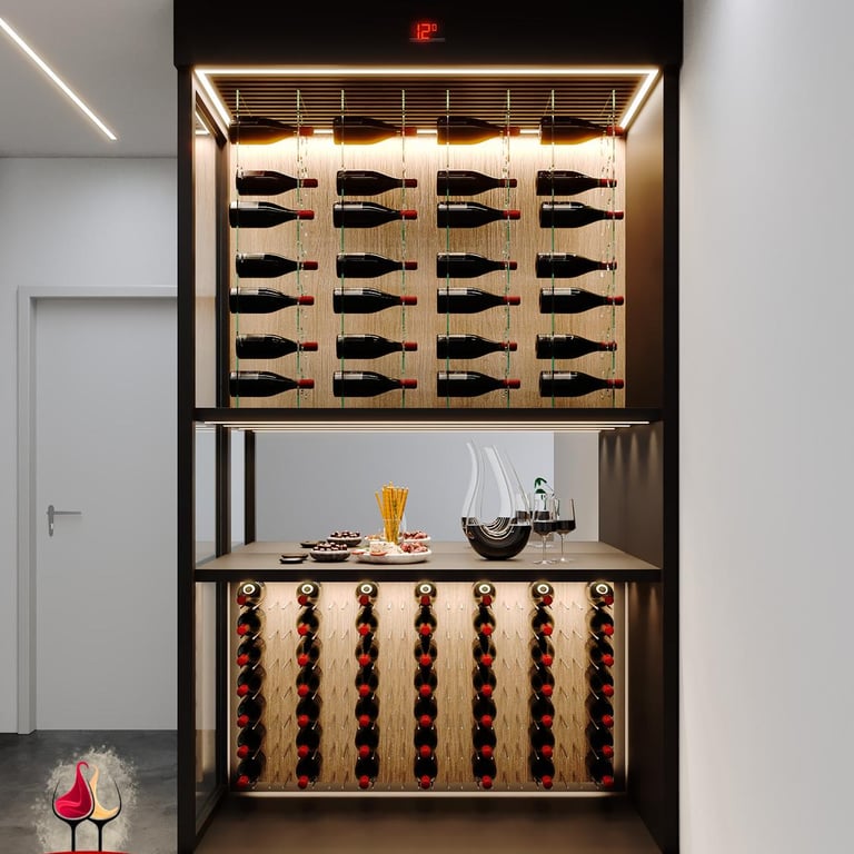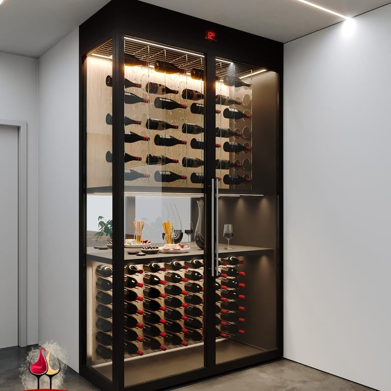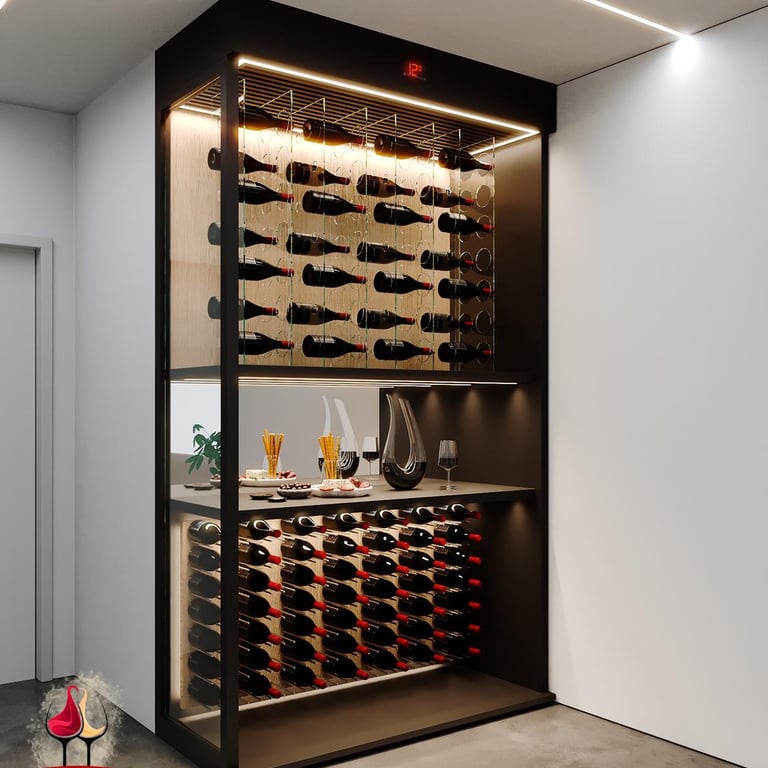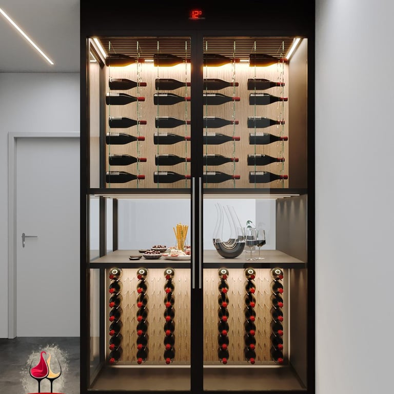 Cada garrafa repousa em equilíbrio, pronta para transformar cada taça em uma viagem de sabores.
